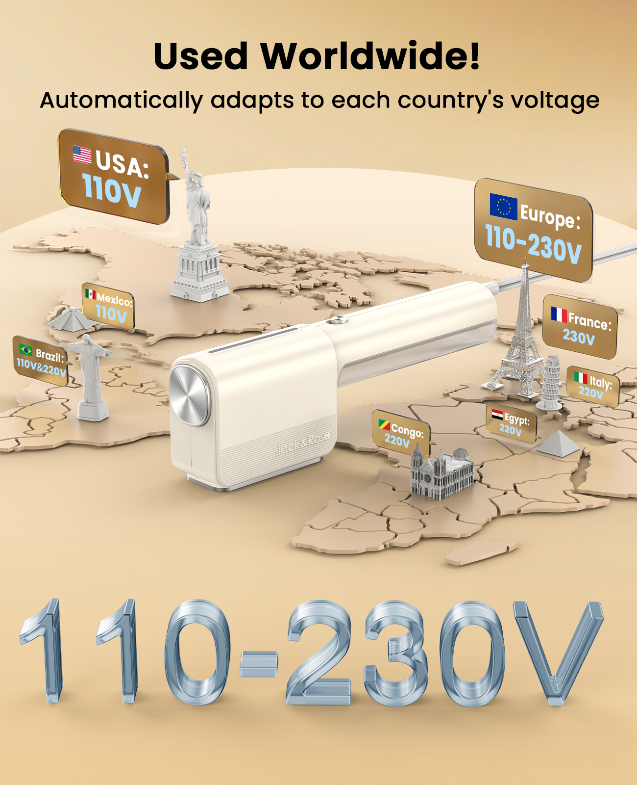 110V-220V TRAVEL STERAMER: Dual voltage travel Steamer features intelligent voltage recognition technology that automatically adapts to 110V-220V voltages, making it plug-and-play around the globe. Whether you're in a cozy European boutique hotel, a stylish New York apartment, or the bustling business center of Tokyo, the Jack & Rose will provide you with powerful, reliable steam to keep you looking sharp and professional wherever you go.